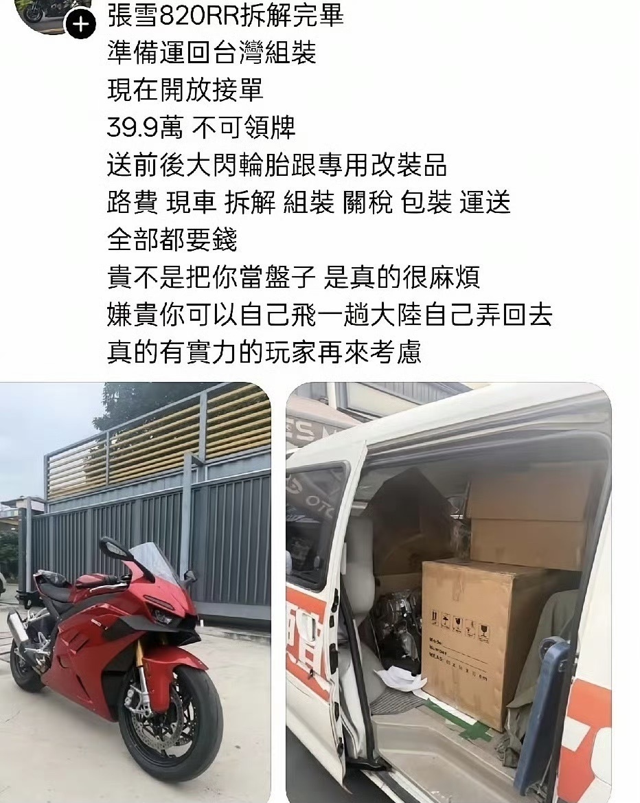 820RR基础款在大陆的定价是4.38万元,该网友在台湾卖39.9万新台币,约合8.7万人民币,直接翻倍!而且张雪机车在台湾还不能上牌照。